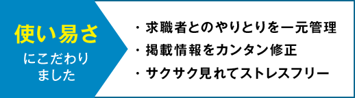 - 求人票を載せるだけじゃない!完全無料で採用ページの作成や応募者管理、連絡までサイト内の機能でラクラク可能!